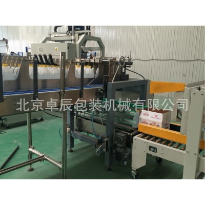 自动装箱机能自动将包装物整形排列,装入打开的纸箱中,并完成不干胶封口等动作的装箱设备,所有动作都是全自动完成的。大多数自动装箱机采用新型为组合结构,包括成箱装置、整列装置、充填装置和封箱装置等功能单元,分别完成相应的功能动作,各装置都安装在同一主机架上。成箱装置的箱坯架在上方,充填装置在成箱装置正下方,整列装置在充填装置的前方,封箱装置在充填装置的后方。采用P.L.C + 触摸显示屏控制。设有缺瓶报警停机,无瓶不装箱装置。大大方便操作、管理、减少生产人员和劳动强度,是自动化规模生产的设备。