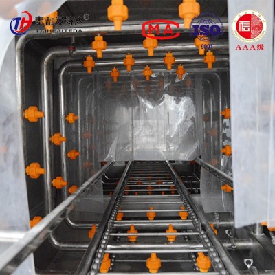 3、清洗喷嘴立体四方位安装结构,冷、热水清洗、使清洗更加彻底,每一根喷嘴管道都可以达到无工具拆装,方便操作工人每班次清理卫生无死角。
